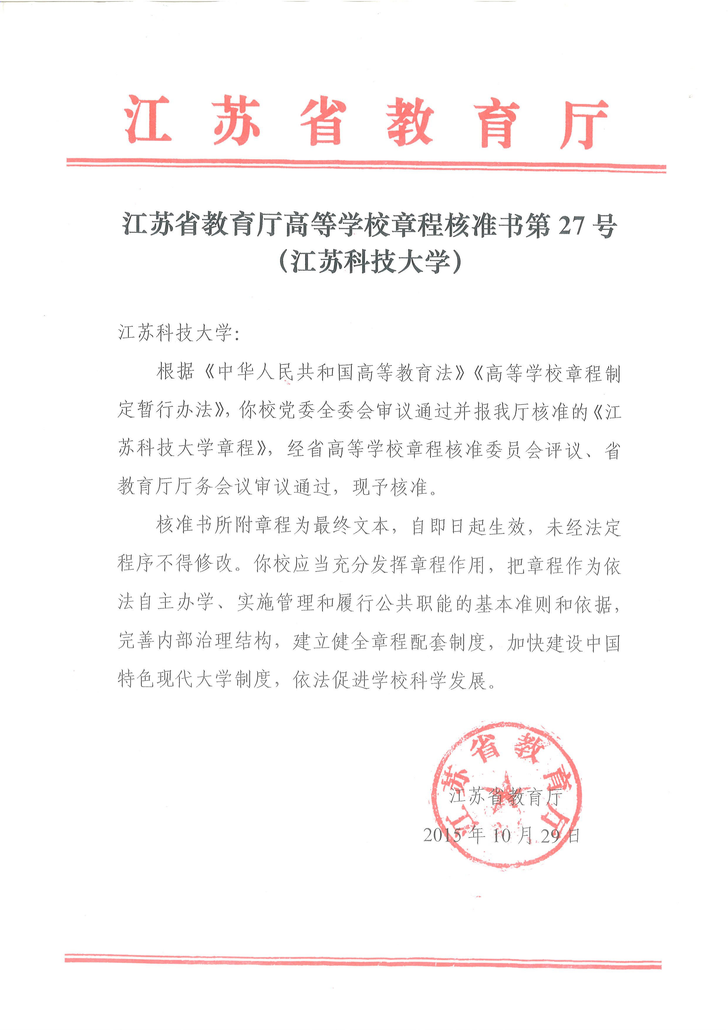 第一百零五条 本章程的制定与修改,须经学校教职工代表大会审议、校长办公会审核、校党委会审定,由学校法定代表人签发,报江苏省教育厅核准后发布,并报教育部备案。