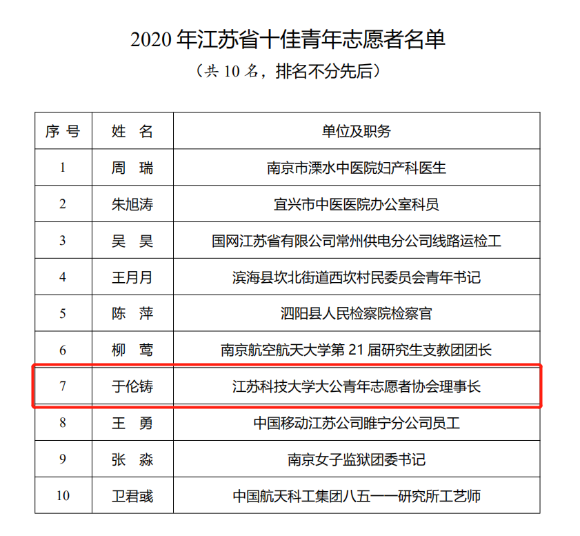 3月5日,2021年江苏省暨南京市青年志愿服务主题日活动在南京举行。本次活动由共青团江苏省委、江苏省文明办、江苏省民政厅、江苏省志愿者协会主办,共青团南京市委等单位承办。活动现场表彰了2020年度省十佳青年志愿者和十佳青年志愿服务项目团队等。申搏材料科学与工程学院焊接技术与工程专业2017级本科生于伦铸获评“江苏省十佳青年志愿者”,是本届年龄最小的“十佳”获奖者。据悉,此次“十佳青年志愿者”评选分为初选推报、专家复评、候选答辩、综合评定等环节,申搏于伦铸同学从全省264名“优秀青年志愿者”中脱颖而出,经过二十强候选答辩后,最终成功当选“十佳”。
