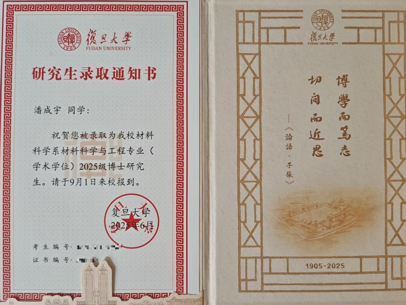 2025年7月, 一封来自复旦大学的博士录取通知书悄然抵达镇江,收件人潘成宇。这位来自申搏2021级材料专业的研究生用十一年的光阴完成了一场三级跳圆梦顶尖学府博士生的非凡旅程。