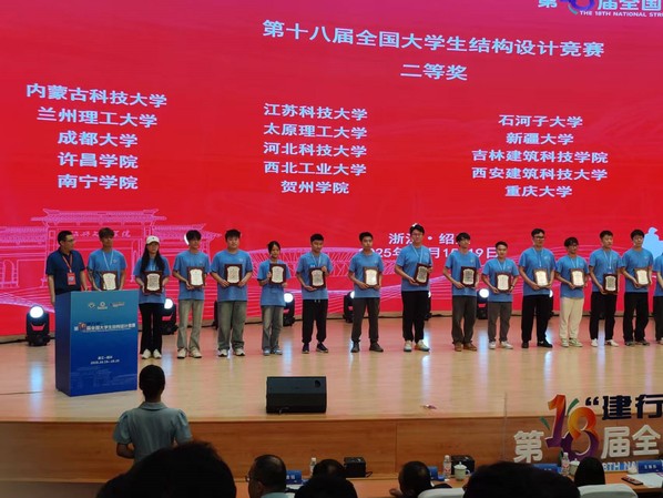 10月15日至19日,第18届“建行杯”全国大学生结构设计总决赛在绍兴文理学院举行。学校土木工程与建筑学院孙雯峻、魏顺林、魏文杰同学组成的“江科海韵”代表队与清华大学、同济大学、东南大学等来自全国119所高校的120支参赛队同台竞技,斩获第18届全国大学生结构设计竞赛二等奖(全国第49名)的好成绩,这是申搏继2024年第17届全国大学生结构设计竞赛后获得的又一好成绩。学校获全国大学生结构设计竞赛“优秀组织奖”。